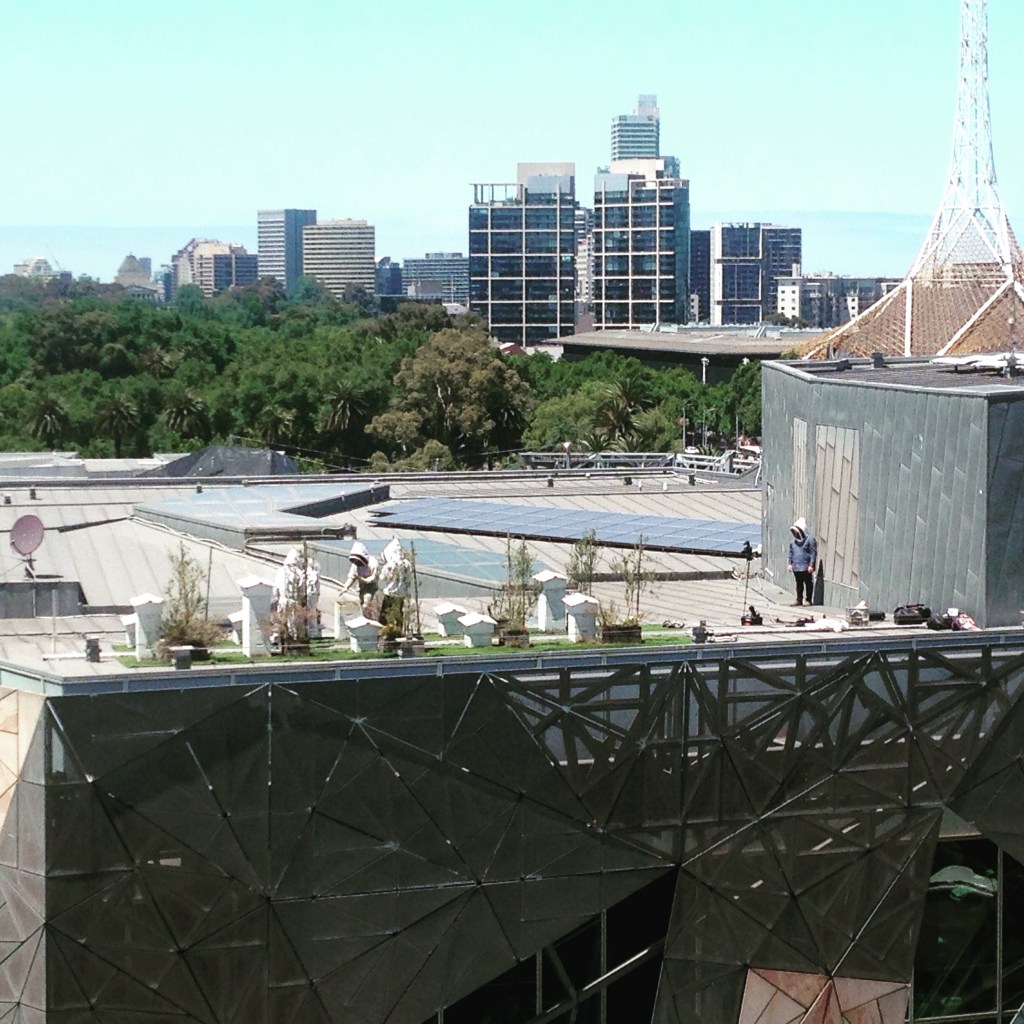 Image: the photo is of the beekeepers doing their thing on the ACMI roof. The view is from my office.