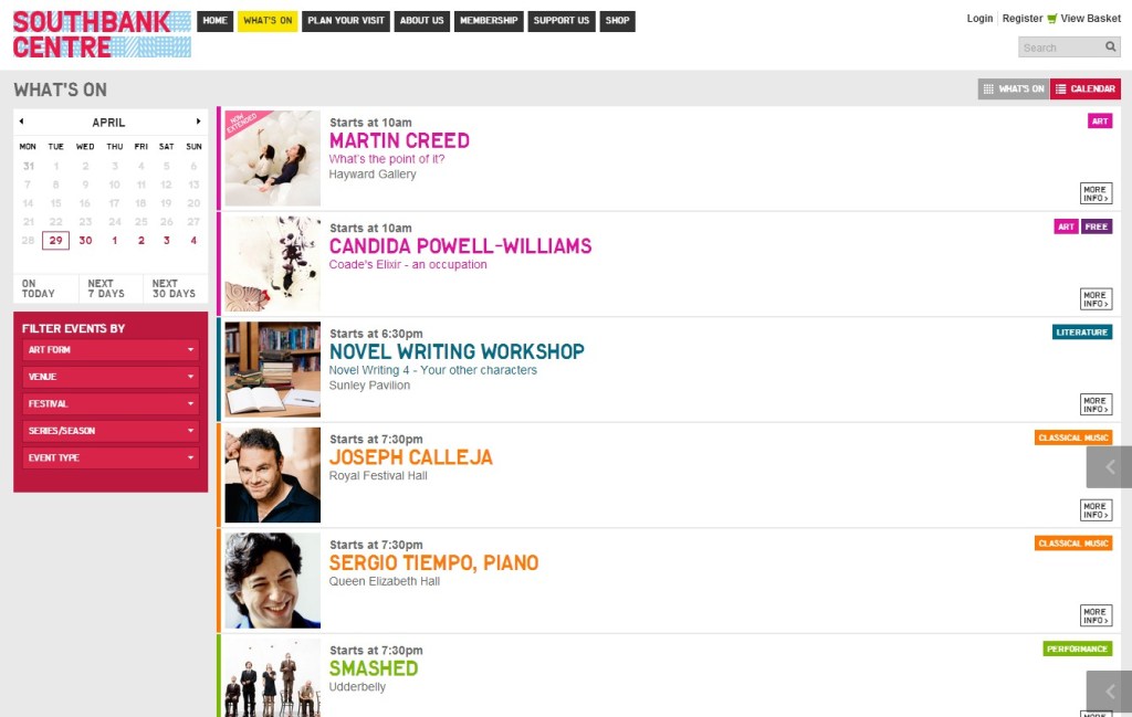 Project managed the development of the new what’s on list view on the Southbank Centre website. An alternative view to the image-led tile view so users can easily scan all events on in a day. Moving to this also gave us more room to put important information like venue, start time and artform tags. This came out of research and use testing as much improved the user experience.